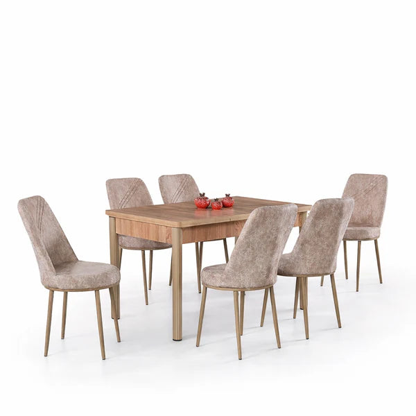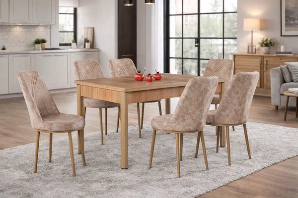 Маса LINEA Дъб Сонома с шест стола -Стабилна и функционална маса. Конструкцията е здрава, с устойчиви метални крака, които осигуряват надежна опора. Повърхността е гладка, лесна за почистване и подходяща както за ежедневна употреба, така и за специални поводи.